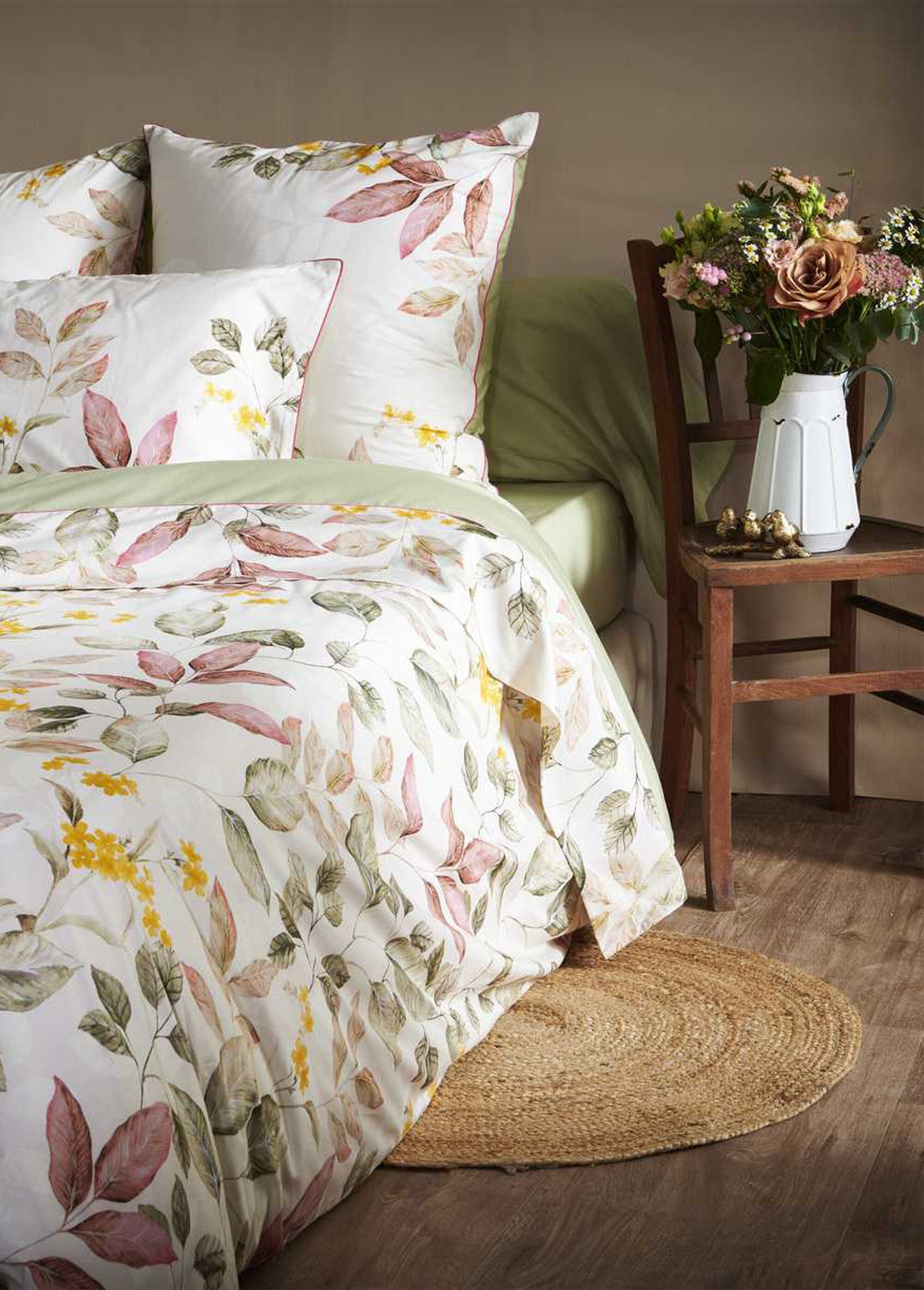Discover the Maria collection, a perfect blend of timeless elegance and inspiring floral designs. Carefully made from 80 thread count cotton percale, this range of household linen embodies softness and comfort. Subtle powder and sage tones evoke the tranquility of an autumn garden, while delicate fall leaves and sunny yellow flowers add a warm, invigorating touch. Details of the fitted sheet: • 35cm cap • plain sage green Let yourself be seduced by the floral elegance of Maria, an inexhaustible source of inspiration to create a true cocoon of relaxation and beauty.